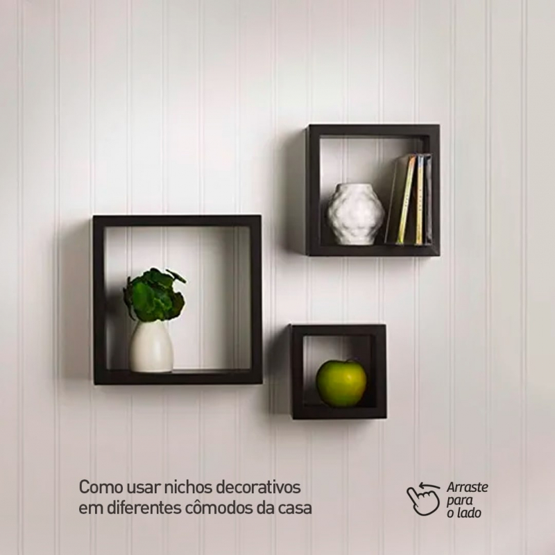Alinhados: Essa aqui é a forma mais tradicional e ‘certinha’. Por isso, inclusive, que a opção de manter os nichos alinhados é perfeita para quem quer transmitir equilíbrio, simetria e seriedade