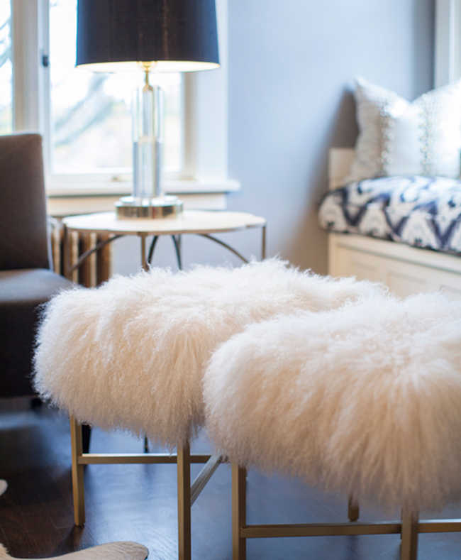 A textura do pelo deixa os tapetes e elementos pontuais e vai direto para os móveis. Poltronas extremamente confortáveis abraçam os corpos com a pelúcia, deixando tudo mais quente e aconchegante!