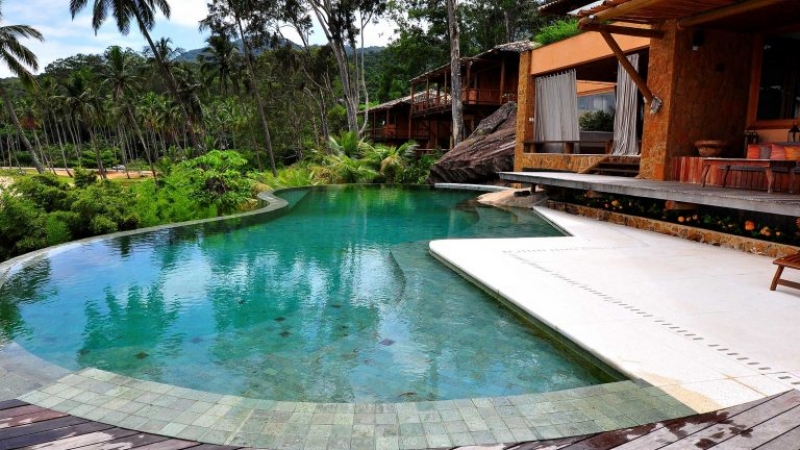 Embora não seja usado com tanta frequência, o revestimento com pedras dá um efeito lindo nas piscinas. As mais indicadas são as vulcânicas, como a Hijau, que tem o aspecto liso e deixa a água com um tom semelhante ao do mar.