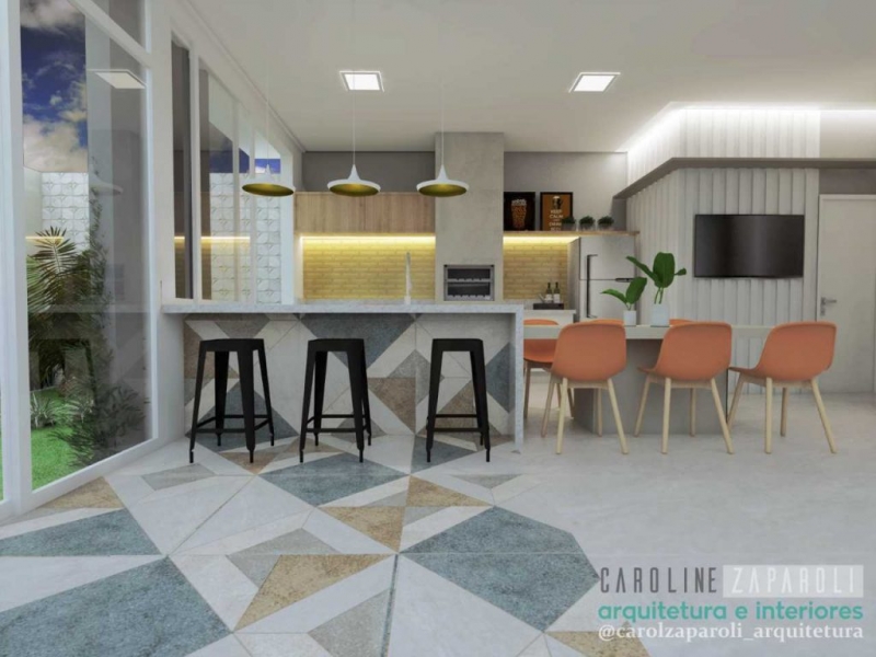 Desta forma os pisos são o destaque, e as paredes são lisas ou estruturadas em cores como terracota, amarelo, verde, azul e coral, buscando neutralizar mobiliários e elementos decorativos camuflando com combinações de materiais diferentes com características estéticas semelhantes.