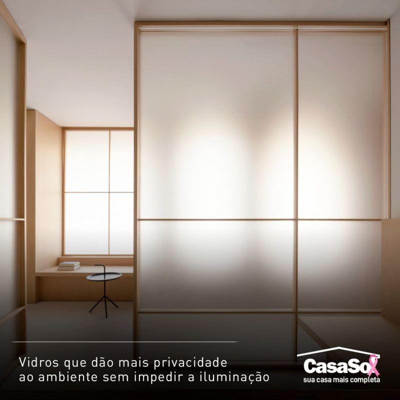 Vidro Jateado: Esse vidro passa por um processo de jateamento com areia em alta velocidade, criando uma superfície fosca! Assim o vidro continua permitindo a passagem de luz, mas impede que os objetos no interior do ambiente sejam vistos pelo outro lado.